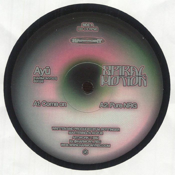 Milan Rottinger’s Ayu project has become a familiar sight on Prague’s Harmony Rec., with the producer releasing a gaggle of solo and collaborative EPs since joining the label in 2024. Even so, Spiral Motion is still his first collection of solo original productions for well over 18 months. He delivers two fresh cuts on side A: the surging, trance tempo dark-room throb of ‘Come On’, where murky synth motifs and urgent spoken word samples catch the ear, and the more expressively psychedelic – but no less trance-inducing – ‘Pure NRG’. Both cuts get remixed on the flip, with the deliciously loose-limbed and acid-flecked IN2STELLAR rub of ‘Come On’ being joined by a more minimalistic, trippy and bass-heavy interpretation of ‘Pure NRG’ by Canadian artist D Tiffany.